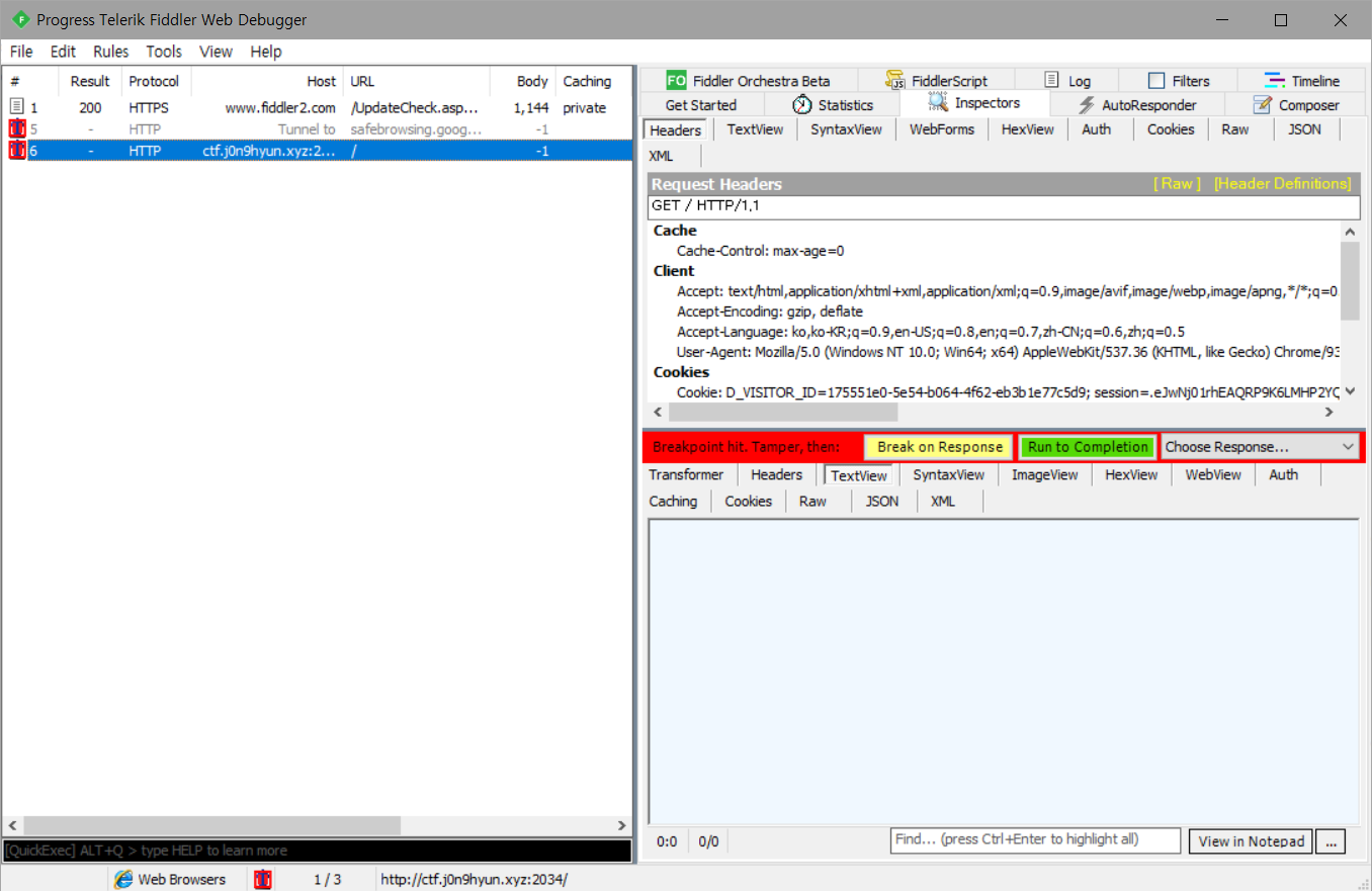 구글링 끝에 X-Forwarded-For (XFF) 헤더를 통해 IP를 식별할 수 있다는 점을 캐치하고 Fiddler를 통해 패킷을 잡아보기로 했습니다.